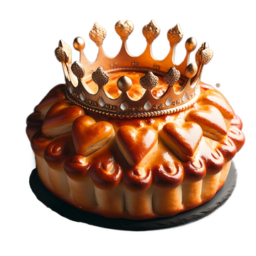 A galette-style pie decorated with a golden crown and served warm with a la mode option.