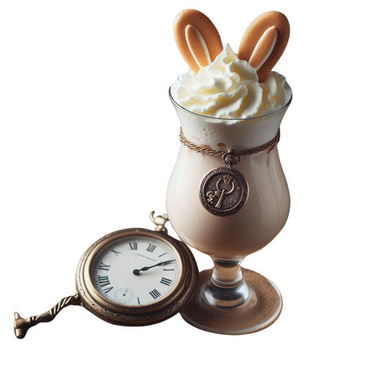 This cocktail is a Wonderland take on the White Russian. The mix of vodka, coffee liqueur, and heavy cream with vanilla cookie bunny ears tastes like softly boozy vanilla ice cream, with only a hint of vodka's burn. The stopwatch it comes with may help keep the time on your gamba adventures!